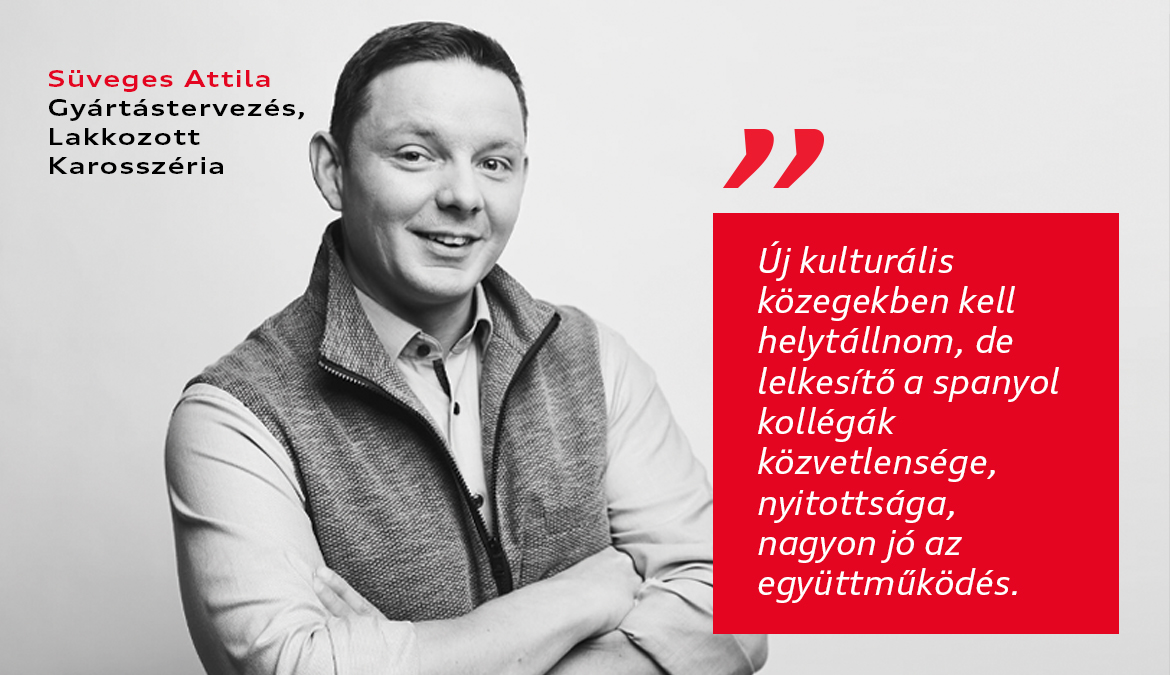 2021 áprilisa óta Ingolstadtban dolgozom kiküldetésben. Projektvezetőként a fő feladatom, hogy a Q3 és CUPRA modelleket előkészítsük a lakkozási folyamatokra, illetve, hogy a győri lakkozót átépítsük azoknak az elvárásoknak megfelelően, amelyeket a gyártás támaszt. Emellett összefogom azokat a részprojekteket is, amelyeknek a különböző gyártási területeken kell megvalósulniuk. A munkámat kifejezetten érdekessé teszi, hogy most először egy másik márka kollégáit is be kell vonnunk a tervezésbe. Új kulturális közegekben kell helytállnom, de lelkesítő a spanyol kollégák közvetlensége, nyitottsága, nagyon jó az együttműködés. Ez nagyon fontos számomra, hiszen feladat van bőven. A lakkozóban mi biztosítjuk a karosszéria korrózióvédelmét is, így számos apró részletre kiterjedően kell összehangolnunk a két márka munkamódszereit, folyamatait és igényeit. Egy példa: a CUPRA Terramar modellben nincs alumínium karosszériaelem, ugyanakkor a spanyol márka által használt matt felületek magas aránya újdonság számunkra. Ezért egy általam koordinált csapattal megvizsgáltuk azokat a kihatásokat, átépítési igényeket, melyekkel a jövőben ki tudjuk szolgálni a megnövekedett matt fényezési igényt. Emellett az olaszországi Lamborghinivel is felvettük a kapcsolatot, hogy megismerhessük a sportautóiknál alkalmazott munkamódszereket.