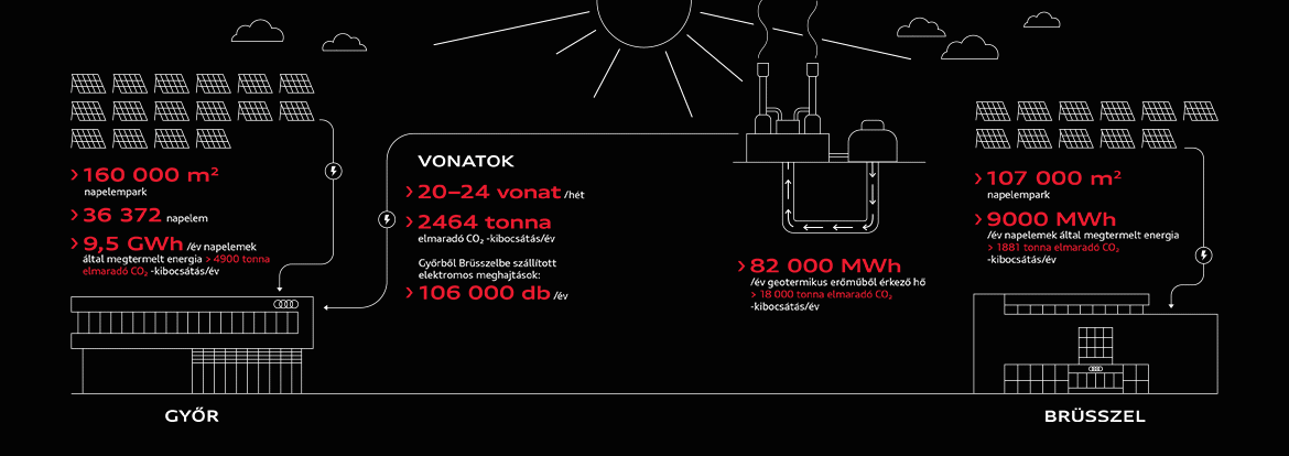 Második pillérként tekintünk a Föld energiájának hasznosítására. Egy 2012-ben üzembe helyezett geotermikus erőművel a vállalat működéséhez szükséges hőenergia több mint hetven százalékát megújuló forrásból fedezzük, amivel az ország legnagyobb ipari geotermikus energiafelhasználói vagyunk. Végezetül a harmadik pillér a szén-dioxid-kibocsátás kompenzálása. Vállalatunk nemzetközileg elismert és hitelesített tanúsítványokat, ún. karbonkrediteket vásárol, ezzel kompenzálva az olyan területek – például motorvizsgáló padok – működését, ahol jelenleg elkerülhetetlen a CO2-kibocsátás. A felelős gondolkodás ugyanakkor nemcsak az egyes telephelyek működésére terjed ki, de a köztük zajló logisztikai árumozgatásra is. Ennek értelmében 2019 óta az Audi Hungaria valamennyi, a DB Cargóval közösen üzemeltetett vasúti anyagszállítása CO2-semlegesen zajlik, vagyis az alkatrészekkel, kész motorokkal és autókkal megrakott szerelvények Győr és Ingolstadt között klímasemlegesen közlekednek. Azonban nem ez az egyetlen logisztikai zöldvonal: az Audi Hungariánál készült, már önmagukban is „zölden” működő elektromos erőforrások szintén fenntartható módon, környezeti terhelés nélkül jutnak el a zöld vonatokon végleges beépítési helyükre, vagyis Brüsszelbe – így az új Q8 e-tron erőforrásaként szolgáló, Győrben gyártott, első és hátsó tengelyekre készülő elektromos hajtás is.